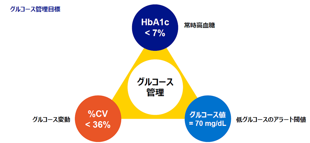 糖尿病標準診療では、HbA1cが7%未満、低グルコースのアラート閾値が70mg/dL、グルコース変動(CV が36%未満など)を統合したグルコース管理⽬標が有⽤である可能性があります。