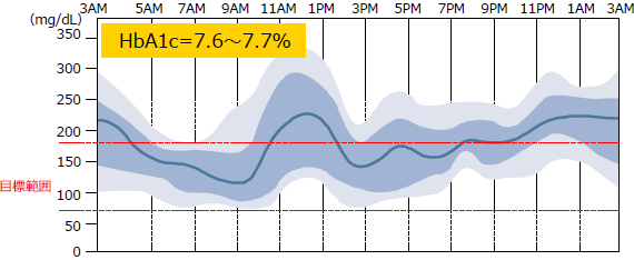 HbA1cが同程度であっても、⾎糖トレンドはさまざまです 。たとえHbA1cが同じ患者さんでも、1⽇における⾎糖変動パターンが⼤きく変動する場合があります 。
