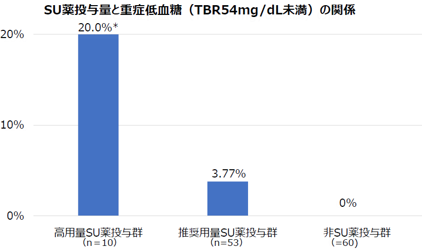 ⾼⽤量SU薬群では、重症低⾎糖(TBR54mg/dL未満)の増加が認められた。