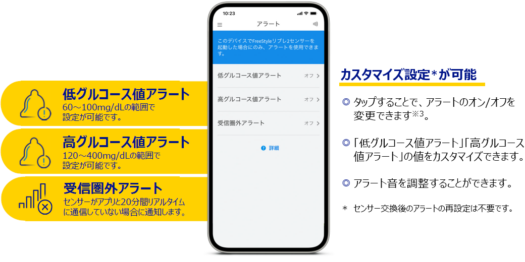 糖尿病のある⼈のライフスタイルに合わせて、「低グルコース値アラート」「⾼グルコース値アラート」「受信圏外アラート」のオン/オフを選択することができます。